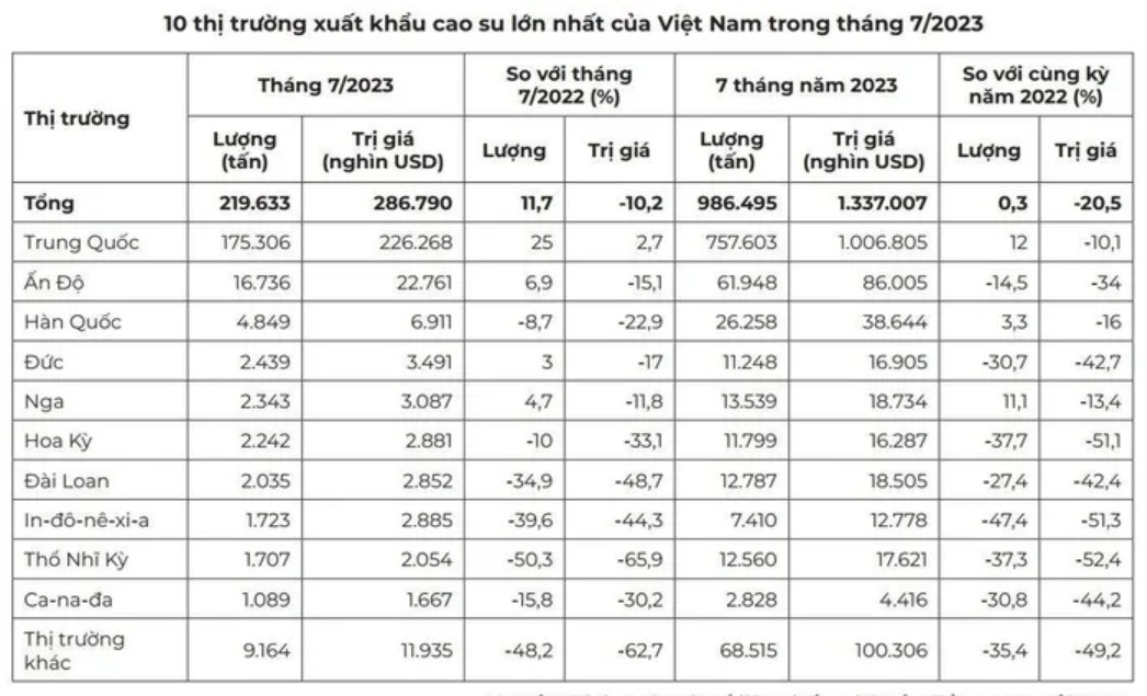 10 thị trường xuất khẩu cao su lớn nhất của Việt Nam trong tháng 7/2023.