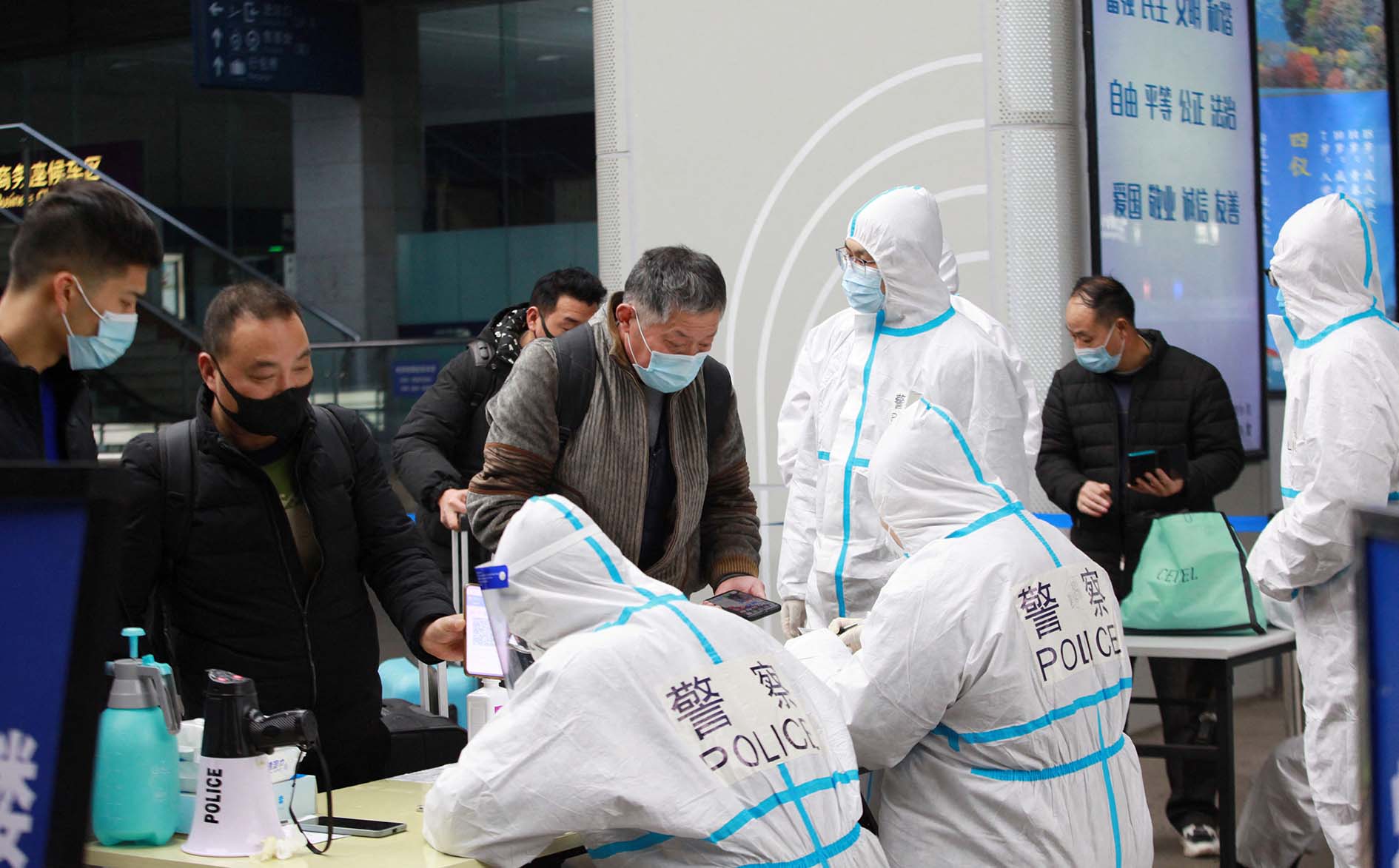 Cảnh sát mặc đồ bảo hộ kiểm tra thông tin sức khỏe của hành khách tại ga TP Nam Kinh, tỉnh Giang Tô (Trung Quốc). Ảnh: REUTERS.