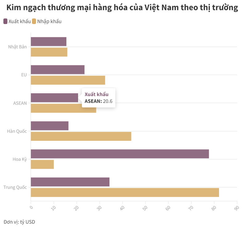 Theo số liệu từ Tổng cục Thống kê, Trung Quốc là thị trường nhập khẩu lớn nhất của Việt Nam với kim ngạch ước đạt 82,1 tỷ USD.