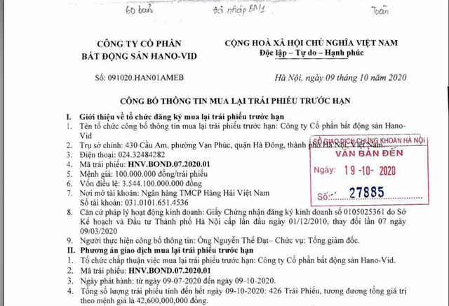 Tuy nhiên, đến ngày 9/10, cùng ngày thông tin phát hành thành công số trái phiếu trên, Hano-Vid cũng công bố thông tin mua lại trái phiếu trước hạn đối với phần lớn số trái phiếu vừa phát hành.