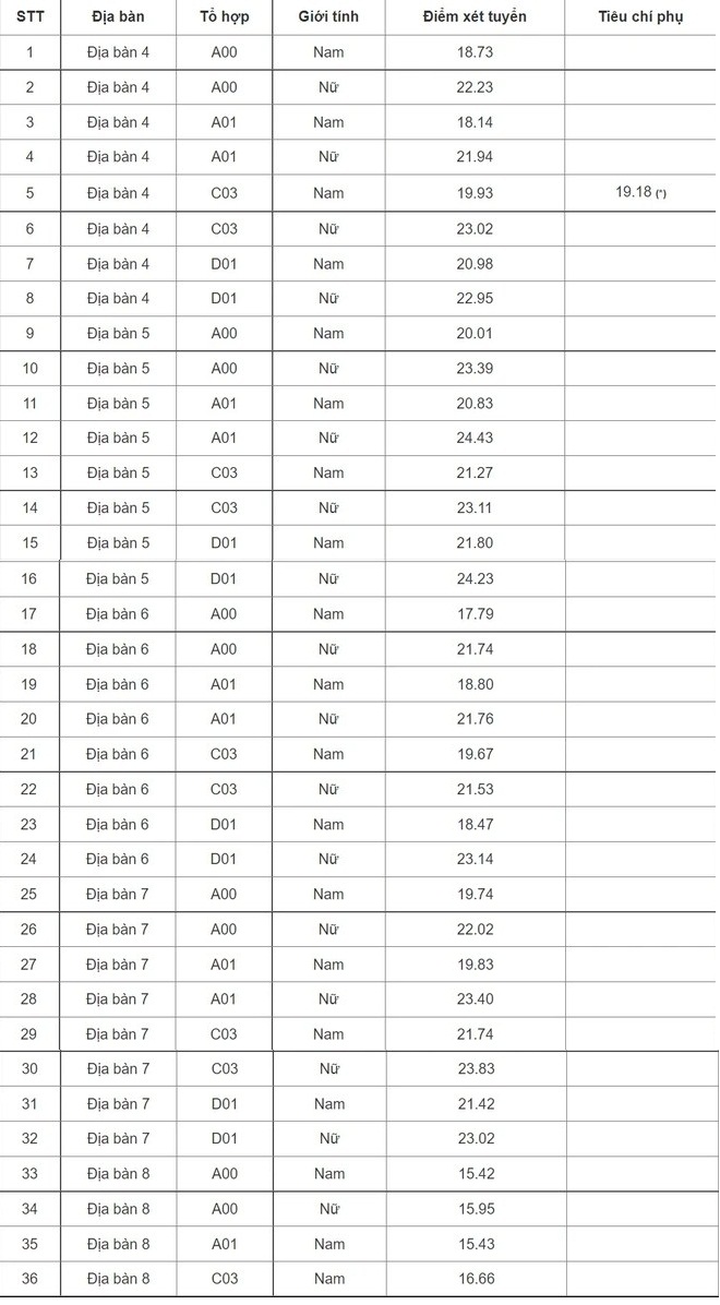 Theo công bố, mức điểm chuẩn dao động từ 15,42 đến 24,43 điểm tùy địa bàn và khối ngành và giới tính. Trong đó, địa bàn 5, khối A01, đối với thí sinh nữ lấy mức điểm cao nhất.