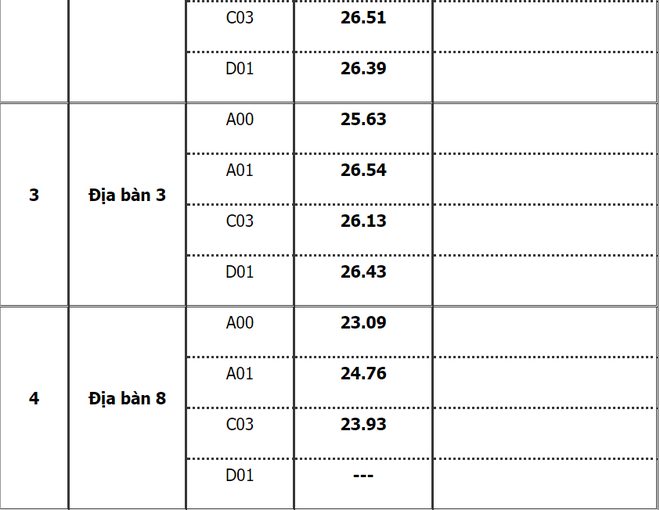 Địa bàn 1 gồm các tỉnh miền núi phía Bắc - Hà Giang, Cao Bằng, Bắc Kạn, Tuyên Quang, Lạng Sơn, Lào Cai, Yên Bái, Điện Biên, Lai Châu, Sơn La và trường Văn hóa 1 (có 1 thí sinh hộ khẩu thường trú tại Lạng Sơn).