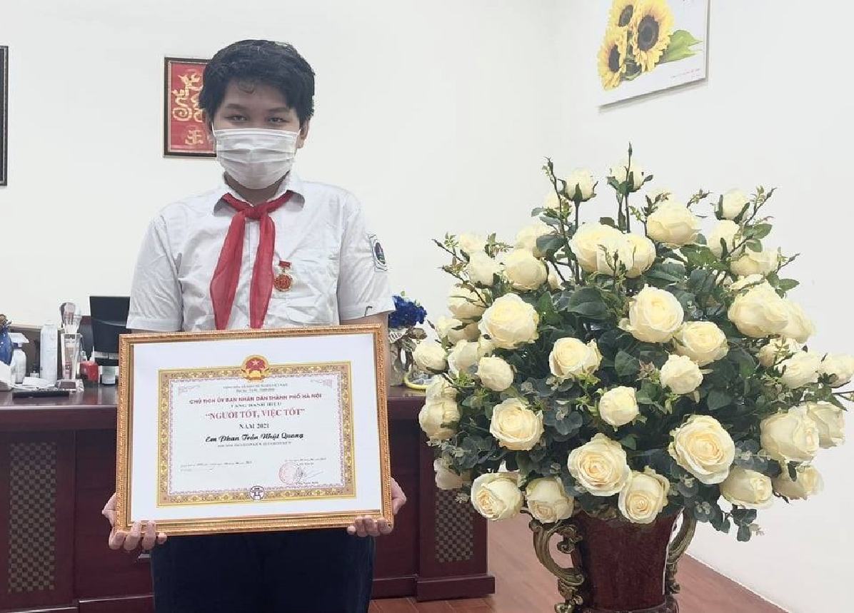 Em Phan Trần Nhật Quang, học sinh lớp 8H, Trường THCS Hoàn Kiếm được nhận danh hiệu "Người tốt, Việc tốt" của Chủ tịch UBND TP. Hà Nội trong năm 2021.