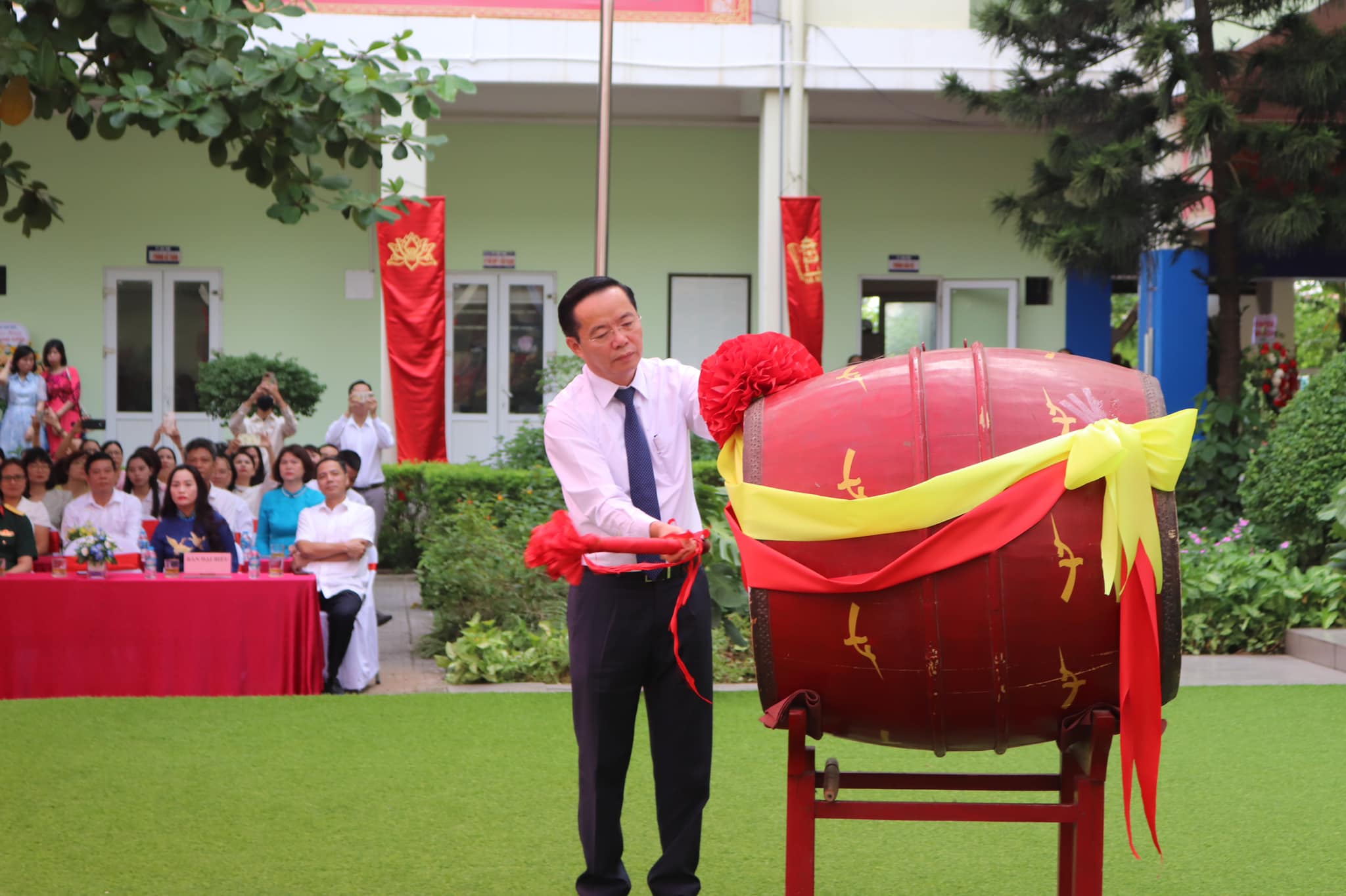 Ông Trần Thanh Long - Uỷ viên thường vụ, quyền chủ tịch quận Nam Từ Liêm đánh trống khai giảng năm học mới tại trường THCS Nam Từ Liêm
