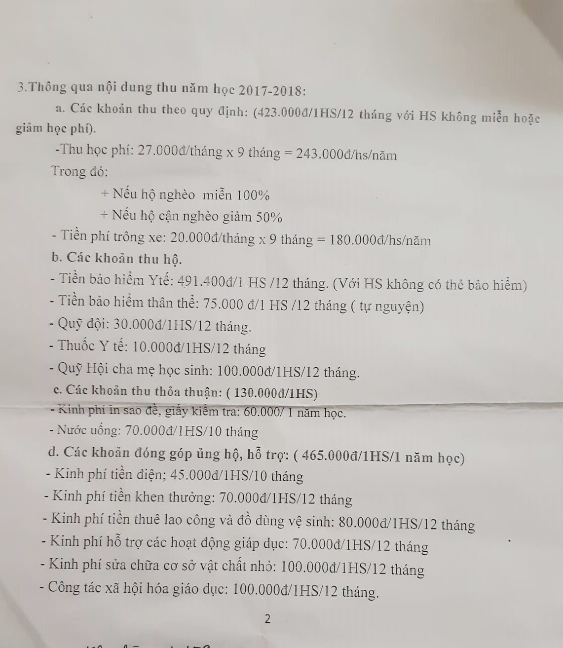 | Nhiều khoản thu các phụ huynh cho rằng quá vô lý của năm học 2017-2018 |