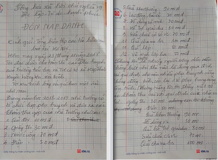 Quá bức xúc trước việc phải đóng hàng loạt khoản thu, riêng các khoản tiền về tự nguyện, tiền đóng góp ủng hộ, hỗ trợ một em học sinh phải đóng là 600 trăm nghìn đồng, phụ huynh đã làm đơn gửi đến cơ quan báo chí.