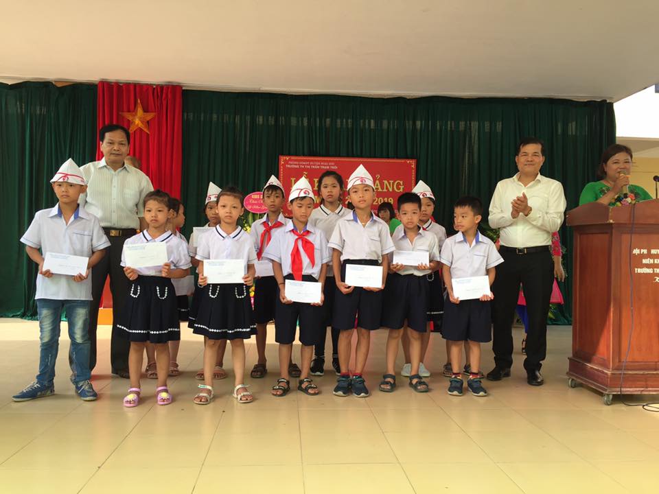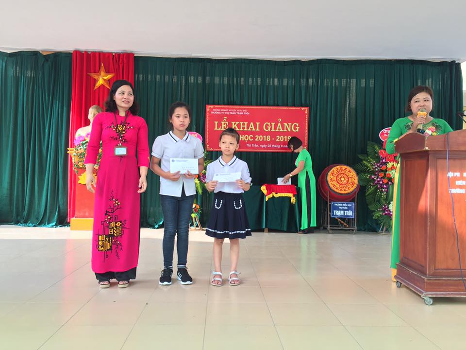 | Hiệu trưởng nhà trường bà Nguyễn Thị Sinh tặng quà biểu dương những học sinh tiêu biểu trong kỳ học hè |