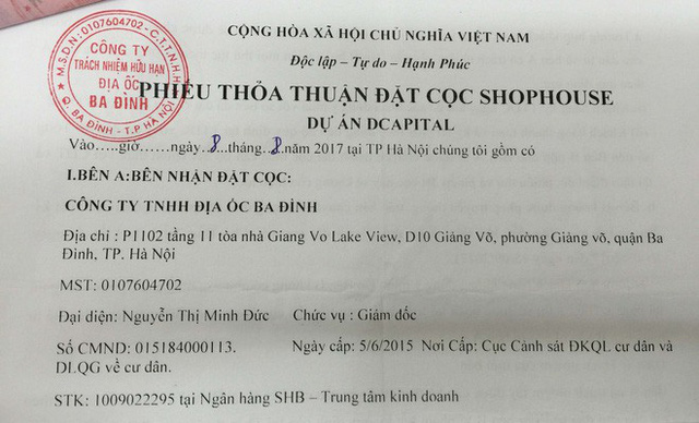 Từ tháng 11/2016, khi khách hàng đến công ty Ba Đình tìm hiểu dự án D’Capitale Trần Duy Hưng, Minh đã giới thiệu cho khách mua các căn shophouse tại dự án này và yêu cầu đặt cọc trước từ 200-500 triệu đồng/căn.