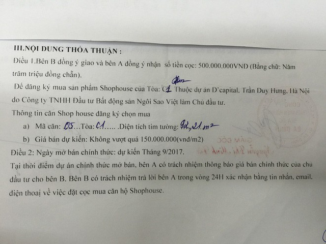Trong phiếu thu tiền, công ty Ba Đình thỏa thuận khoảng tháng 9/2017 khi chủ đầu tư mở bán loại hình shophouse sẽ thông báo cho khách biết để ký hợp đồng. Tuy nhiên quá thời hạn, Phạm Bình Minh không thực hiện việc mua shophouse cho khách, cũng không trả lại tiền.