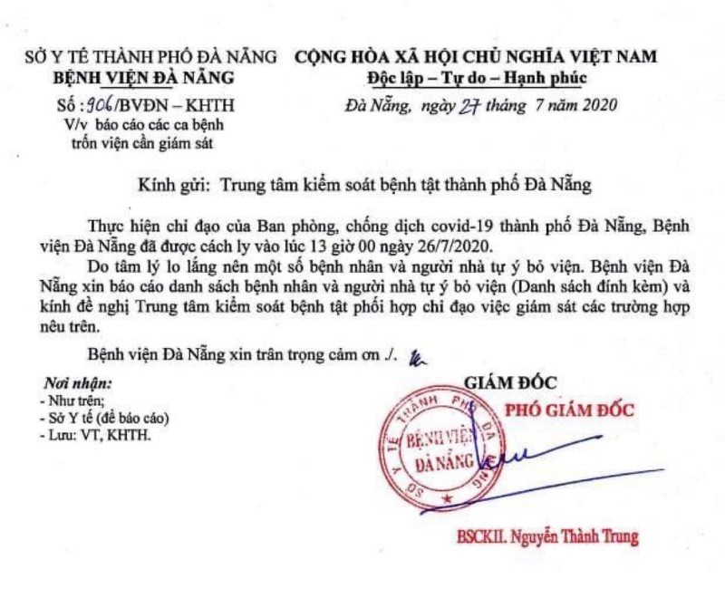 Sáng 27/7, Bệnh viện Đà Nẵng đã có báo cáo gửi Trung tâm Kiểm soát bệnh tật (CDC) TP Đà Nẵng về các ca bệnh trốn viện cần giám sát.