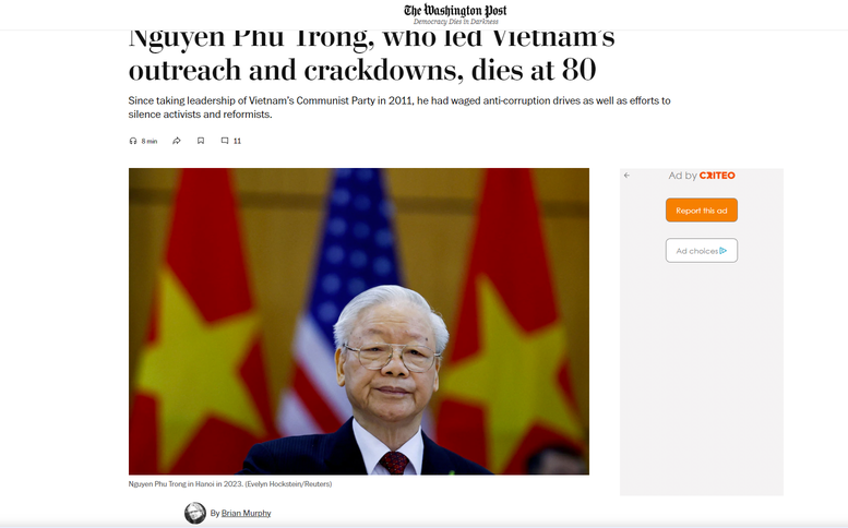 Tờ Le Monde, Le Figaro, hãng thông tấn RFI đều đồng loạt đưa tin Tổng Bí thư Nguyễn Phú Trọng từ trần ở tuổi 80 và đăng chi tiết về tiểu sử Tổng Bí thư cùng những dấu mốc quan trọng.