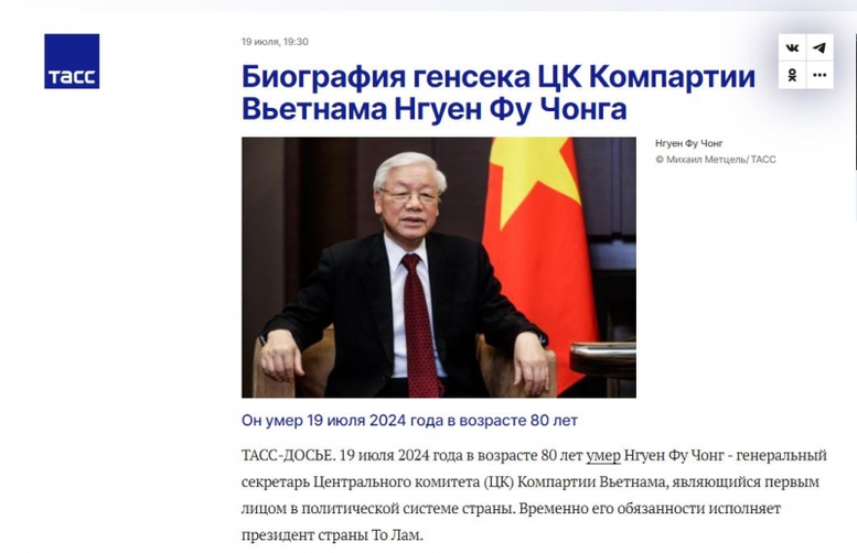 Hãng thông tấn TASS của Nga ngày 19/7 có bài viết khẳng định, Tổng Bí thư Nguyễn Phú Trọng là người đứng đầu hệ thống chính trị Việt Nam, từng kinh qua nhiều vị trí công tác quan trọng. "Đồng chí Nguyễn Phú Trọng đánh giá chuyến thăm của Tổng thống Vladimir Putin rất quan trọng. Theo ông, quan hệ giữa Nga và Việt Nam đang phát triển hiệu quả. Ông đã đề xuất thảo luận thêm thêm các biện pháp nhằm tăng cường quan hệ đối tác chiến lược toàn diện giữa hai nước", TASS nêu.