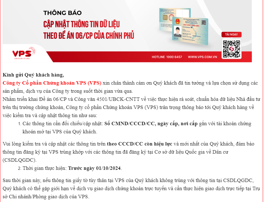 Theo đó, Công ty cổ phần Chứng khoán VPS (VPS) yêu cầu nhà đầu tư kiểm tra và cập nhật các thông tin trên theo CCCD/CC còn hiệu lực và mới nhất, đảm bảo thông tin đăng ký tại VPS trùng khớp với các thông tin đã đăng ký tại Cơ sở dữ liệu Quốc gia về Dân cư trước ngày 1/10/2024.