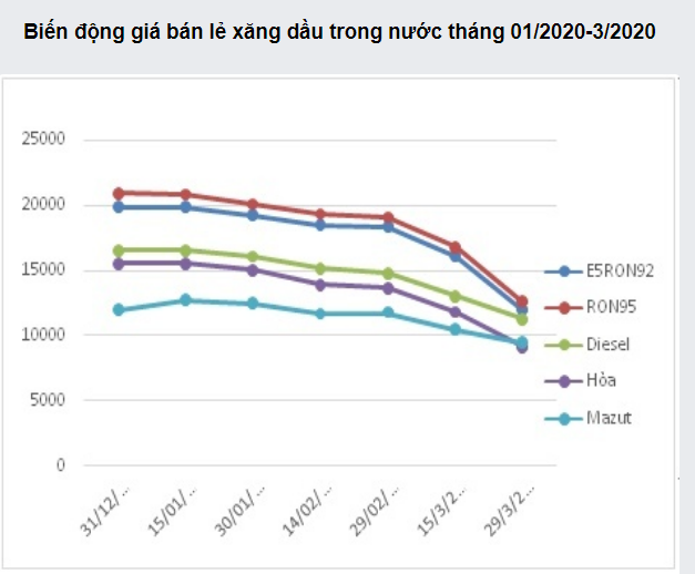 Biểu đồ biến động giá bán lẻ xăng dầu trong nước tháng 1/2020 - 3-2020. Nguồn: BCT.