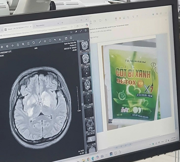 Hình ảnh não bị tổn thương và sản phẩm "cốt bí xanh detox" cô gái sử dụng. Ảnh: H. Mai
