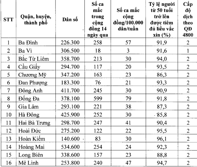 Theo đánh giá cấp độ dịch mới nhất của TP Hà Nội, hiện có 7 huyện, thị xã đạt cấp độ 1, còn lại thuộc cấp độ 2. Xét theo cấp xã, phường, chỉ có 3 nơi bị đánh giá cấp độ 3 gồm: Phố Huế (Hai Bà Trưng), Khâm Thiên và Trung Phụng (Đống Đa).