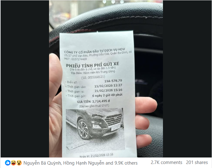 Tuy nhiên, điều khiến dư luận chú ý không nằm ở hình thức của tờ phiếu, mà ở chính con số cuối cùng. Hơn 2,7 triệu đồng cho việc gửi một chiếc ô tô trong khuôn viên bệnh viện là mức phí đủ lớn để tạo ra phản ứng cảm xúc mạnh mẽ, đặc biệt trong bối cảnh người gửi xe là gia đình có con điều trị nội trú.