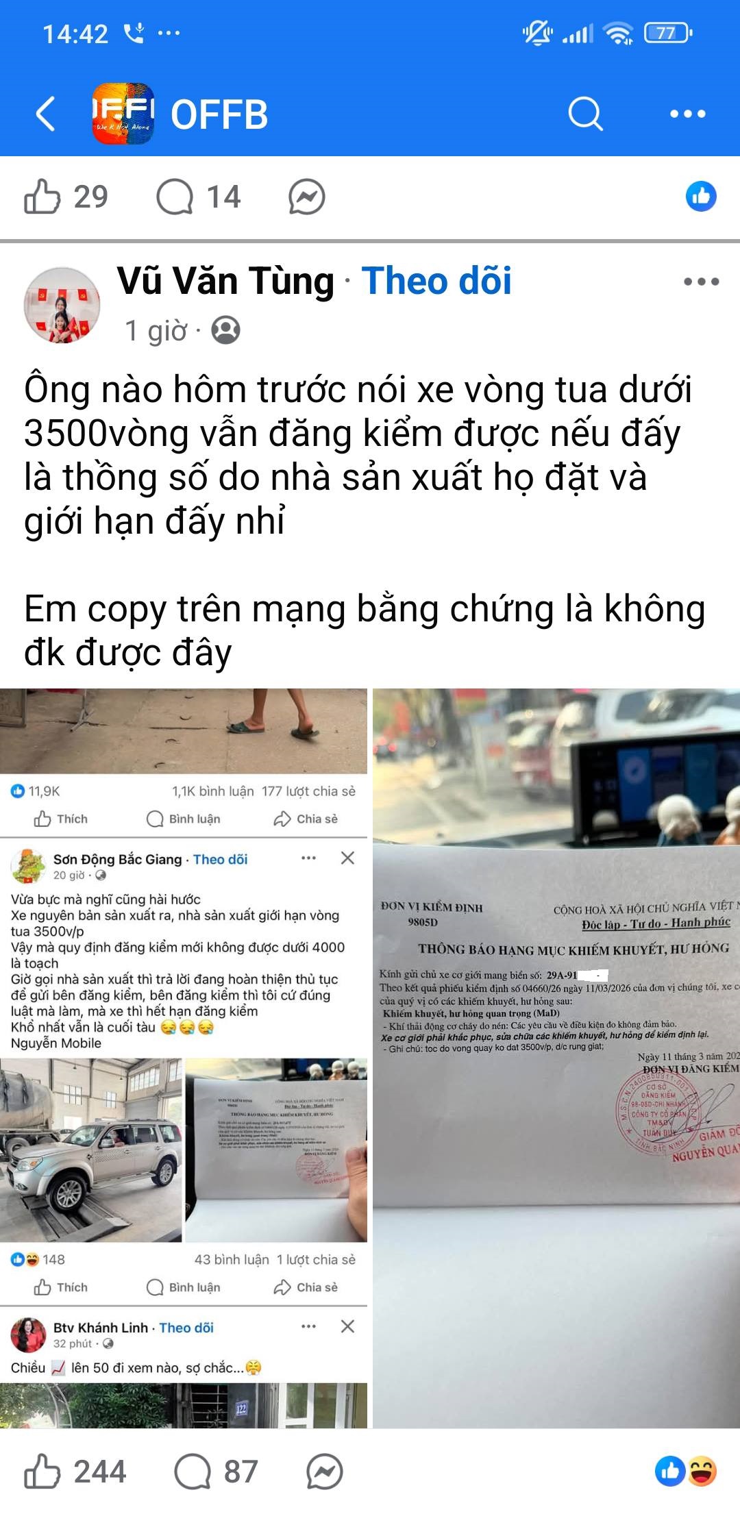 Bài đăng cho biết một chiếc SUV máy dầu mang biển kiểm soát 29A-91x.xx không vượt qua kiểm định kỹ thuật tại trung tâm đăng kiểm. Theo hình ảnh phiếu kiểm định được đăng tải, lý do được ghi nhận là: “Các yêu cầu về điều kiện đo không đảm bảo; tốc độ vòng quay không đạt 3.500 vòng/phút, do rung giật”.