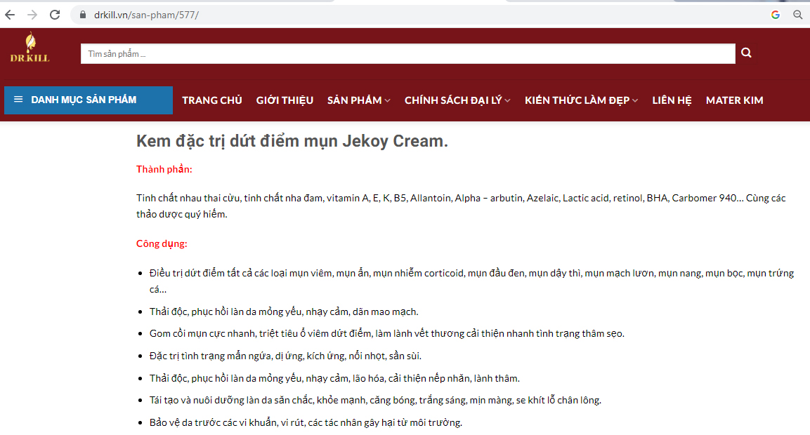 Quy định pháp luật là vậy, tuy nhiên thời gian qua, Tạp chí Thương Trường ghi nhận không ít đơn vị vi phạm quy định về quảng cáo sản phẩm mỹ phẩm. Điển hình như trang web https://drkill.vn/ với thông tin giới thiệu thuộc Công ty TNHH Dược Mỹ phẩm Trị liệu Dr.Kill (có địa chỉ đăng ký doanh nghiệp tại Xóm Liên Đức, Xã Thanh Liên, Huyện Thanh Chương, Tỉnh Nghệ An) liên tục bị người tiêu dùng phản ánh quảng cáo “thổi phồng” công dụng một số sản phẩm mỹ phẩm như thuốc chữa bệnh có dấu hiệu trục lợi?