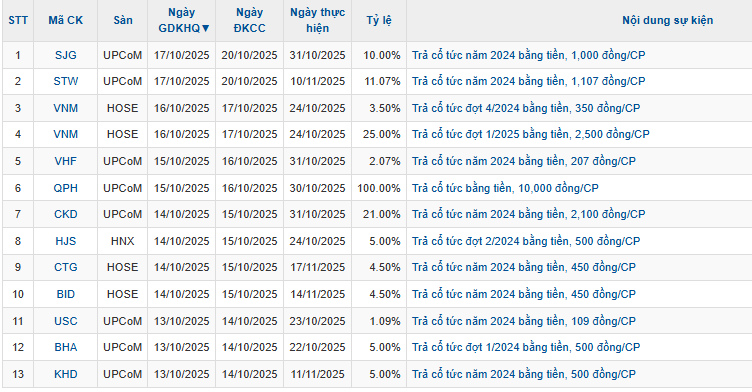 Theo thống kê, tuần từ 13–17/10/2025 sẽ có 18 doanh nghiệp niêm yết thực hiện chốt quyền cổ tức, trong đó 13 doanh nghiệp trả cổ tức bằng tiền mặt, mức cao nhất lên tới 100% và thấp nhất là 1,5%. Bên cạnh đó, có 1 doanh nghiệp trả cổ tức bằng cổ phiếu, 1 doanh nghiệp phát hành thêm, 1 doanh nghiệp thưởng cổ phiếu và 2 doanh nghiệp trả cổ tức kết hợp.