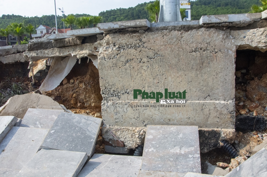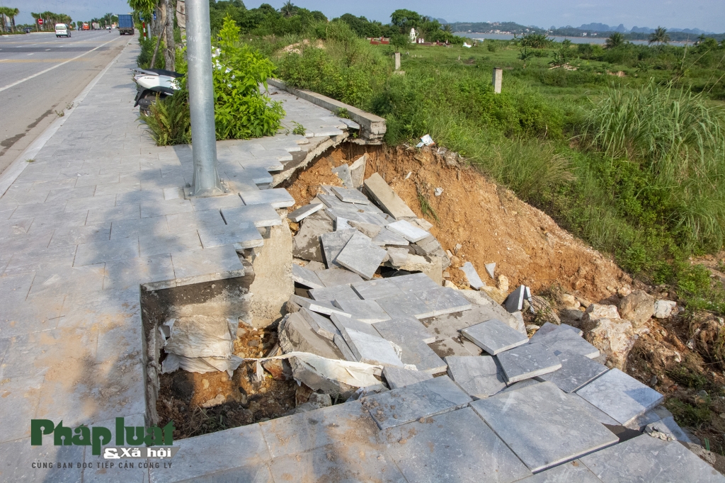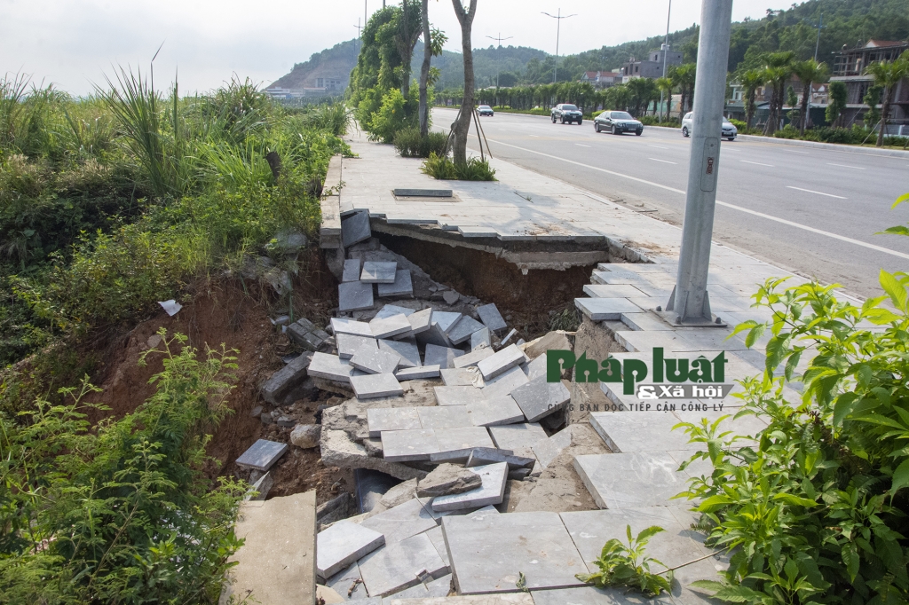 Sau cơn mưa lớn trong 2 ngày từ 1-6, vỉa hè của tuyến đường đẹp và rộng nhất tỉnh Quảng Ninh bất ngờ sụt xuống kéo theo cả đá lát vỉa hè và đất đá trôi xuống trơ cả trụ bê tông của cột điện phía dưới. Điều đáng nói dù đã hơn 1 ngày trôi qua nhưng tại vị trí sụt lún không hề có rào chắn hay thiết bị cảnh báo nguy hiểm nào.