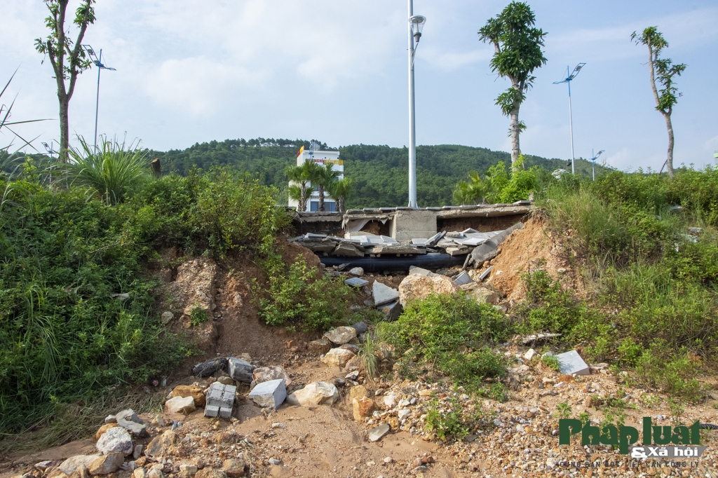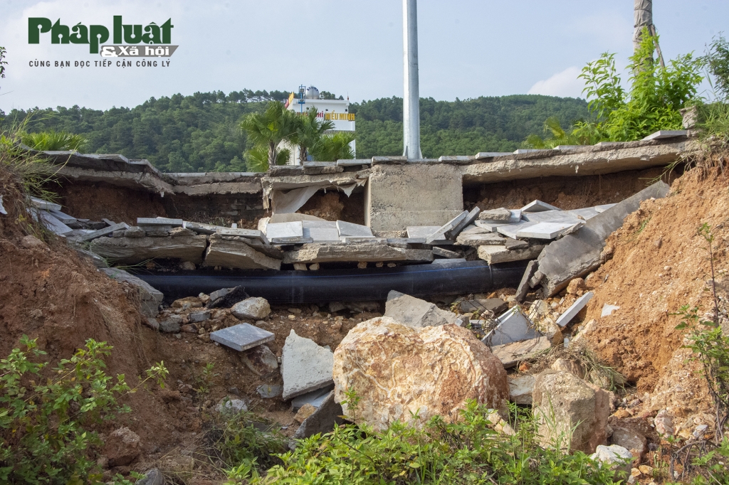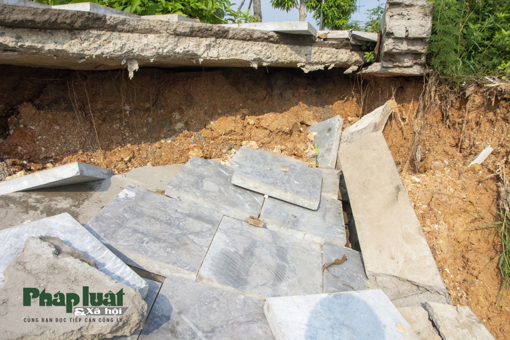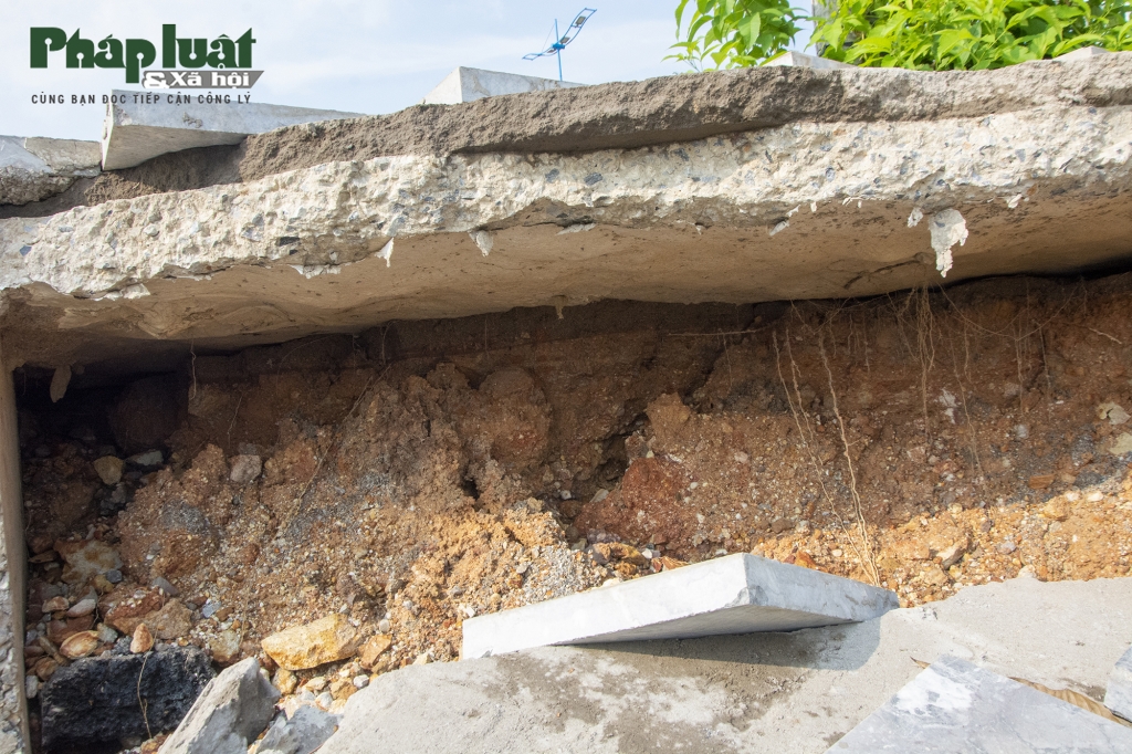 Ngày 3-6, PV báo Pháp luật và Xã hội có mặt tại hiện trường, cả một diện tích lớn vỉa hè rộng chừng gần 20m2 bị sạt xuống dưới cuốn theo cả đất đá và đá lát nền vỉa hè xuống phía dưới ruộng. Vị trí sạt lở dài khoảng 8m rộng hơn 2m và sâu hơn 2m. phía dưới đất đá cũng bị nước xói mòn trơ cả đế trụ điện và phần bê tông vỉa hè phía trên.