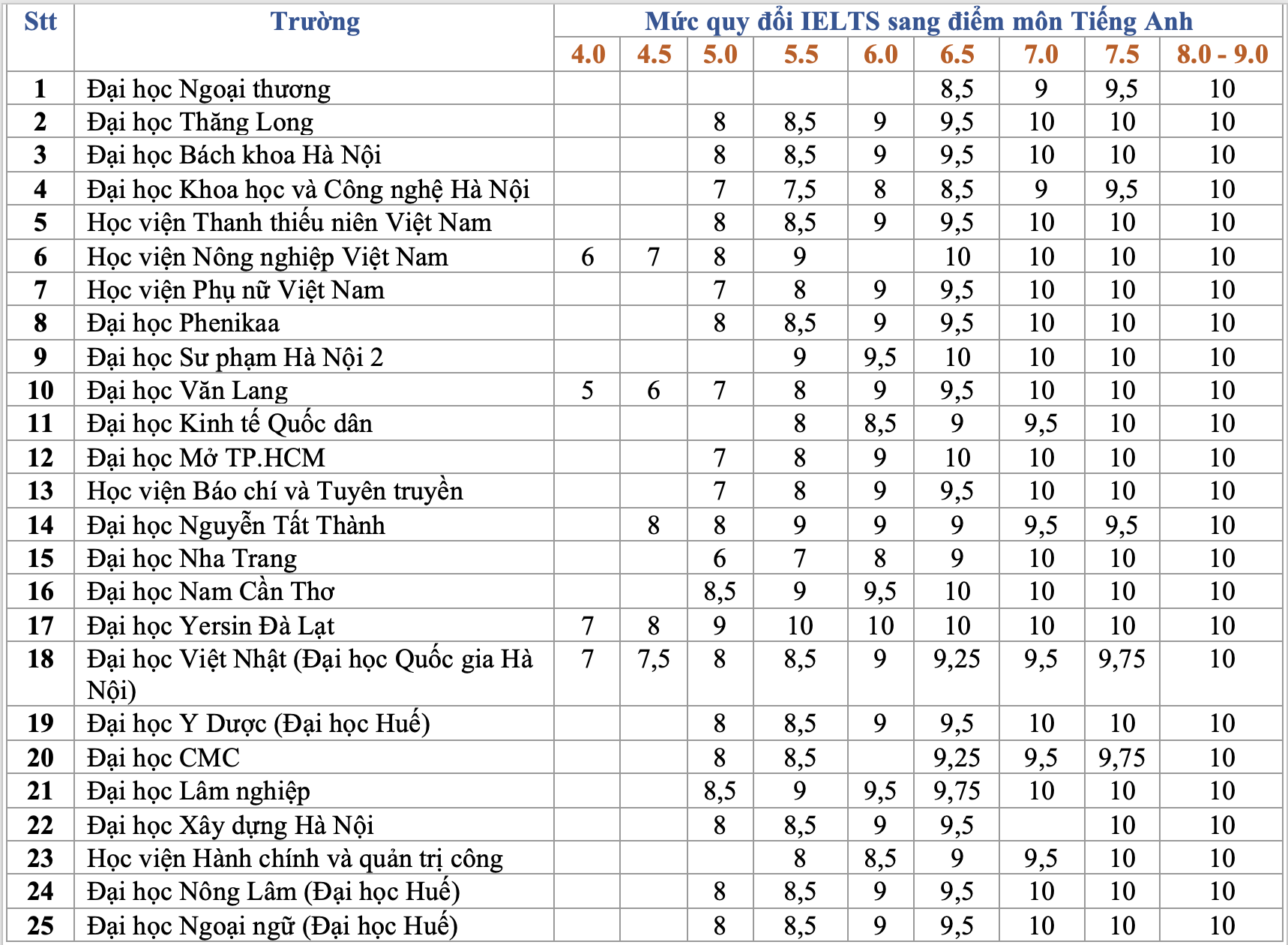 Trong số đó có thể kể đến Trường Đại học Văn Lang, Trường Đại học Nguyễn Tất Thành và Học viện Nông nghiệp Việt Nam. Việc mở rộng ngưỡng quy đổi được cho là nhằm tạo thêm cơ hội xét tuyển cho thí sinh có chứng chỉ ngoại ngữ quốc tế.