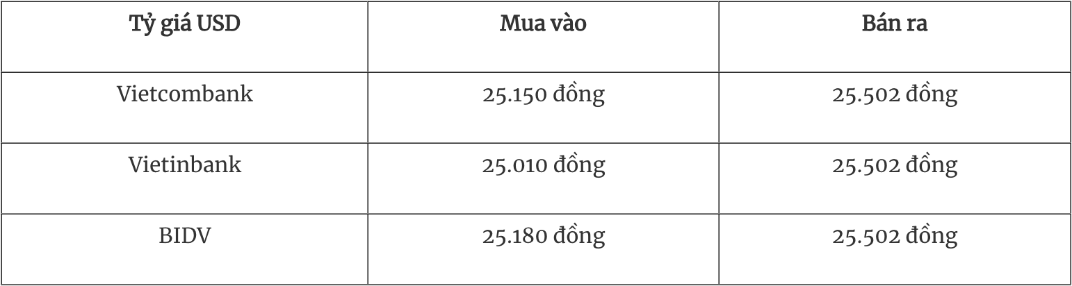 Tỷ giá USD tại các ngân hàng thương mại mua vào và bán ra như sau: