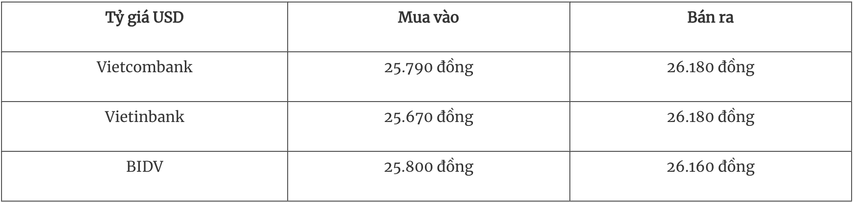 Tỷ giá USD tại một số ngân hàng thương mại mua vào và bán ra như sau: