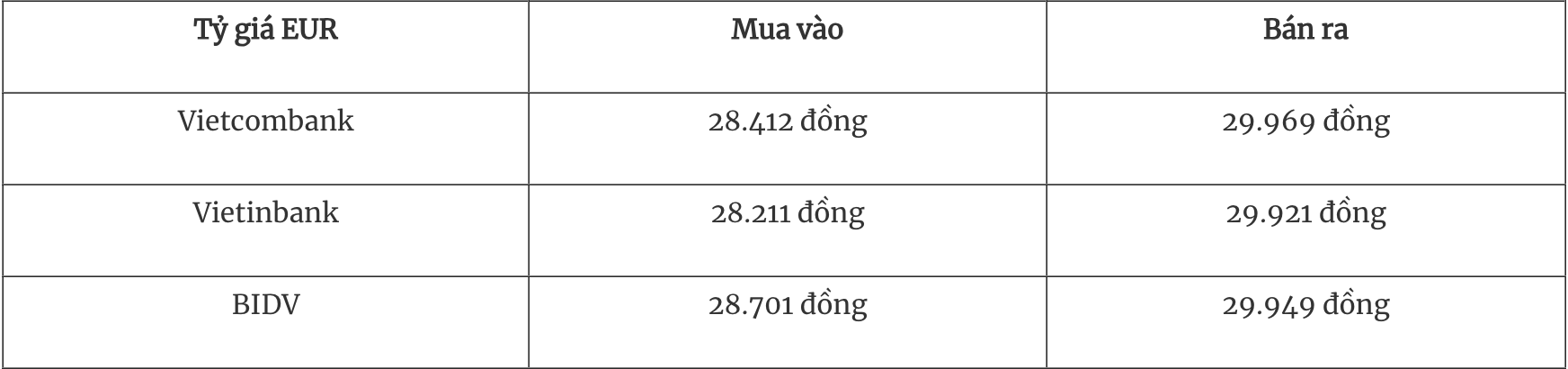 Tỷ giá EUR tại một số ngân hàng thương mại mua vào và bán ra như sau: