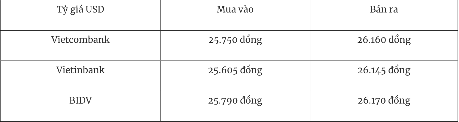 Tỷ giá USD tại một số ngân hàng thương mại mua vào và bán ra như sau: