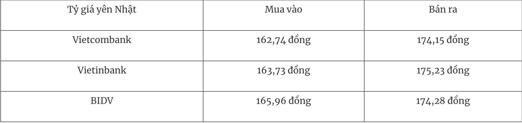 Tỷ giá yên Nhật tại một số ngân hàng thương mại mua vào và bán ra như sau: