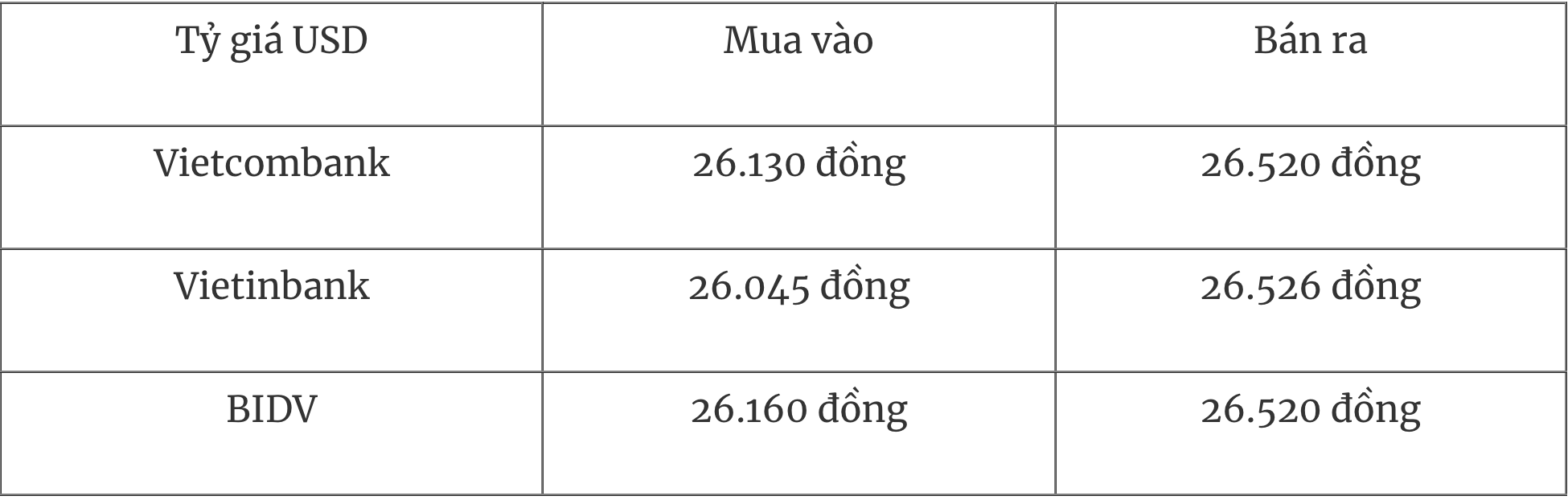 Tỷ giá USD tại một số ngân hàng thương mại mua vào và bán ra như sau: