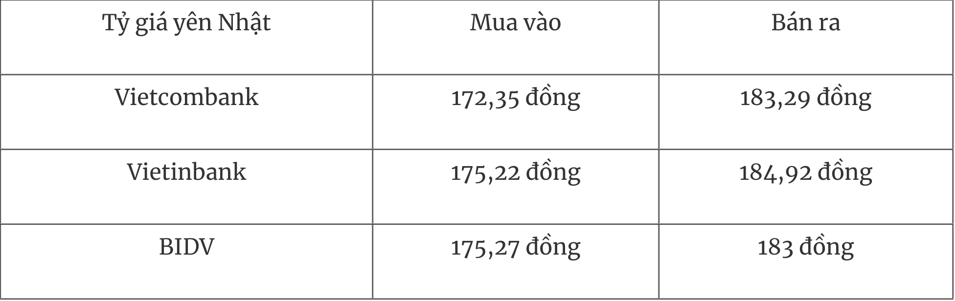 Tỷ giá yên Nhật tại một số ngân hàng thương mại mua vào và bán ra như sau:
