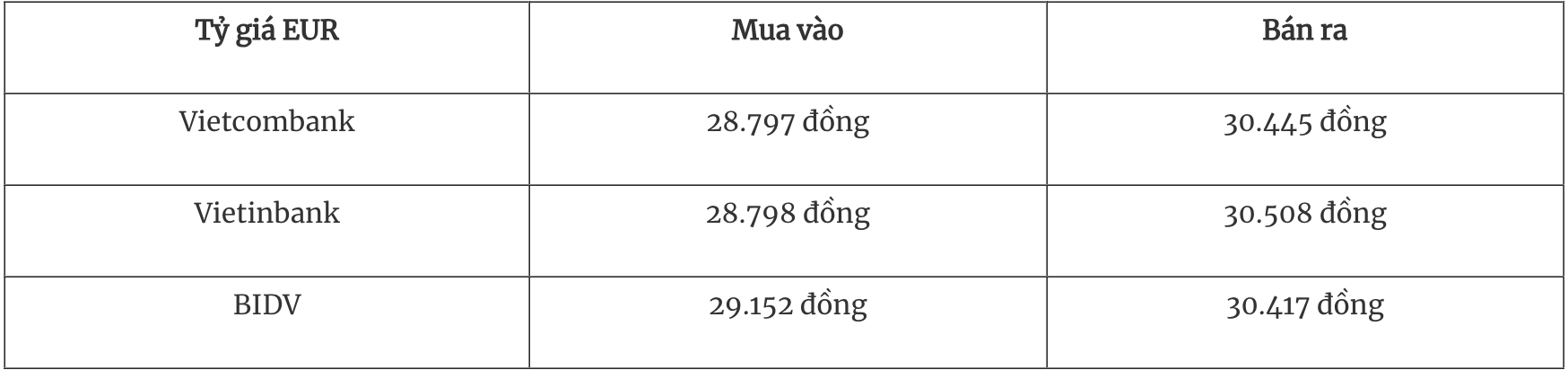 Tỷ giá EUR tại một số ngân hàng thương mại mua vào và bán ra như sau: