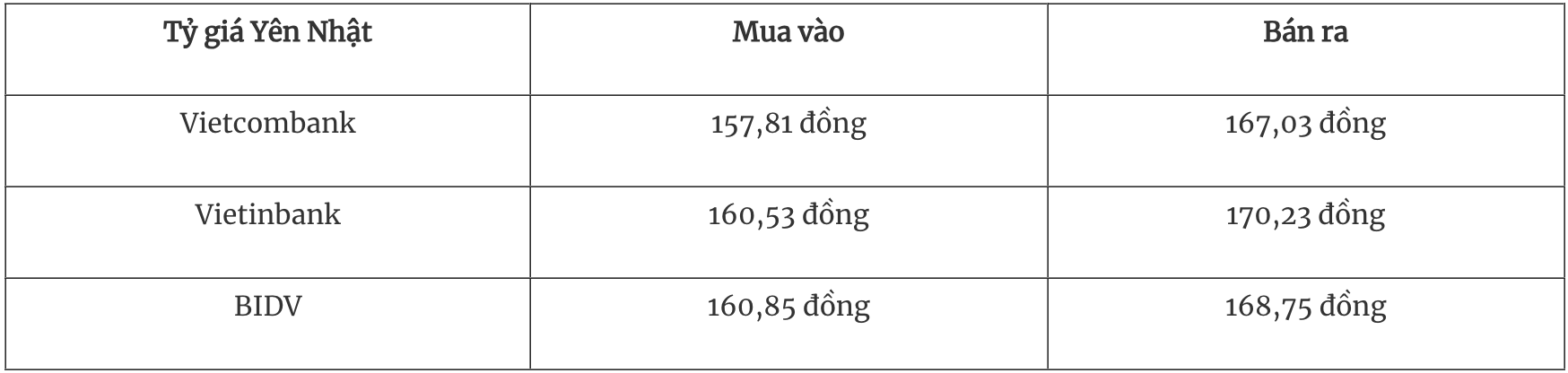 Tỷ giá YEN tại các ngân hàng thương mại mua vào và bán ra như sau: