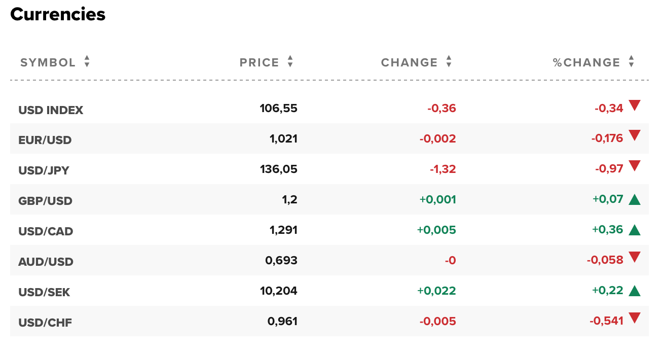 Hiện 1 euro đổi 1,021 USD. 1 bảng Anh đổi 1,2 USD. 1 USD đổi 136,05 yên. 1 USD đổi 1,291 đô la Canada. 1 đô la Úc đổi 0,693 USD, 1 USD đổi 0,961 France Thụy Sĩ.
