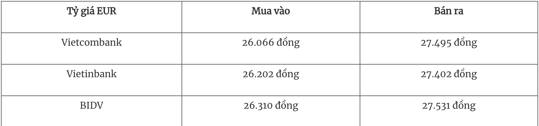 Tỷ giá EUR tại các ngân hàng thương mại mua vào và bán ra như sau: