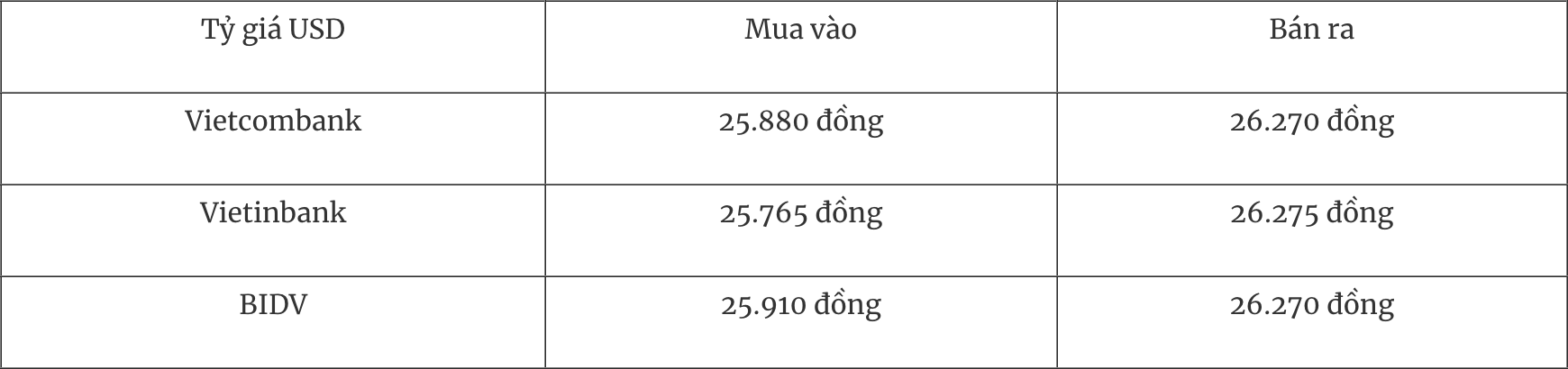 Tỷ giá USD tại một số ngân hàng thương mại mua vào và bán ra như sau: