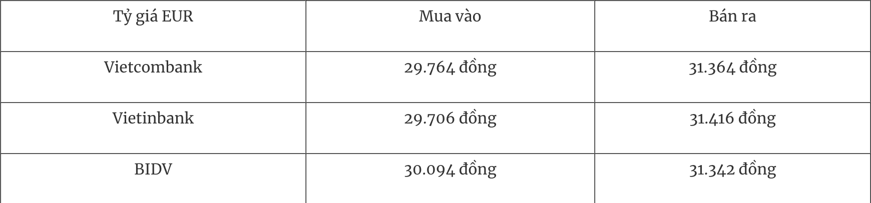 Tỷ giá EUR tại một số ngân hàng thương mại mua vào và bán ra như sau: