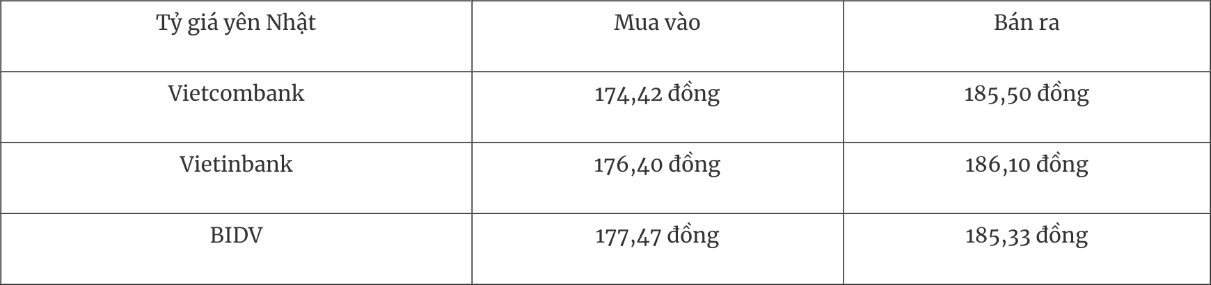 * Tỷ giá yên Nhật tại Sở giao dịch Ngân hàng Nhà nước mua vào - bán ra tăng, hiện ở mức: 165 đồng - 182 đồng.