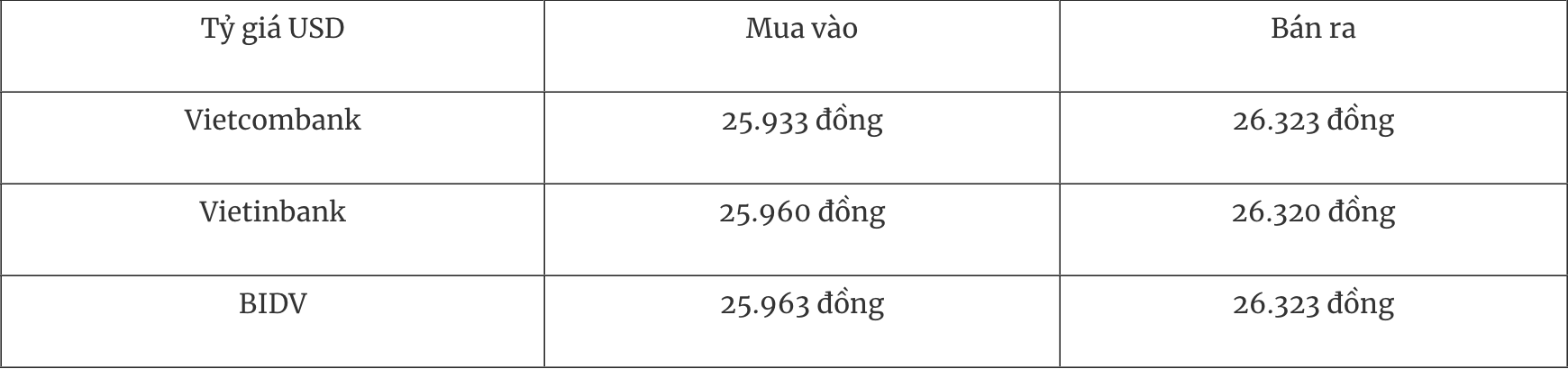 Tỷ giá USD tại một số ngân hàng thương mại mua vào và bán ra như sau: