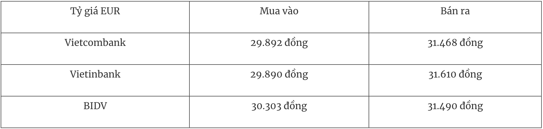Tỷ giá EUR tại một số ngân hàng thương mại mua vào và bán ra như sau: