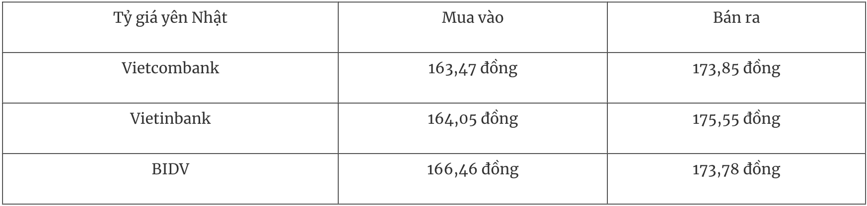 Tỷ giá yên Nhật tại một số ngân hàng thương mại mua vào và bán ra như sau:
