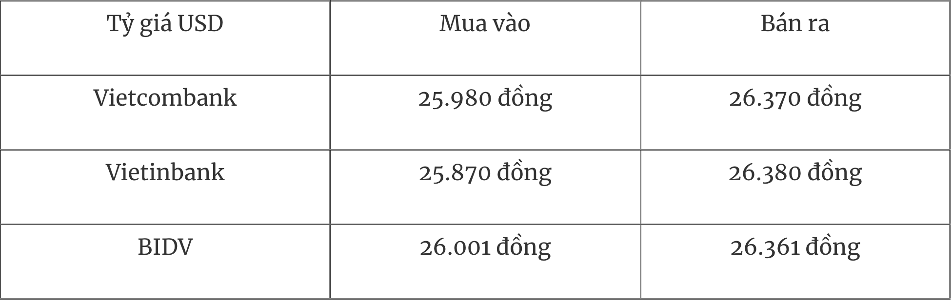 Tỷ giá USD tại một số ngân hàng thương mại mua vào và bán ra như sau: