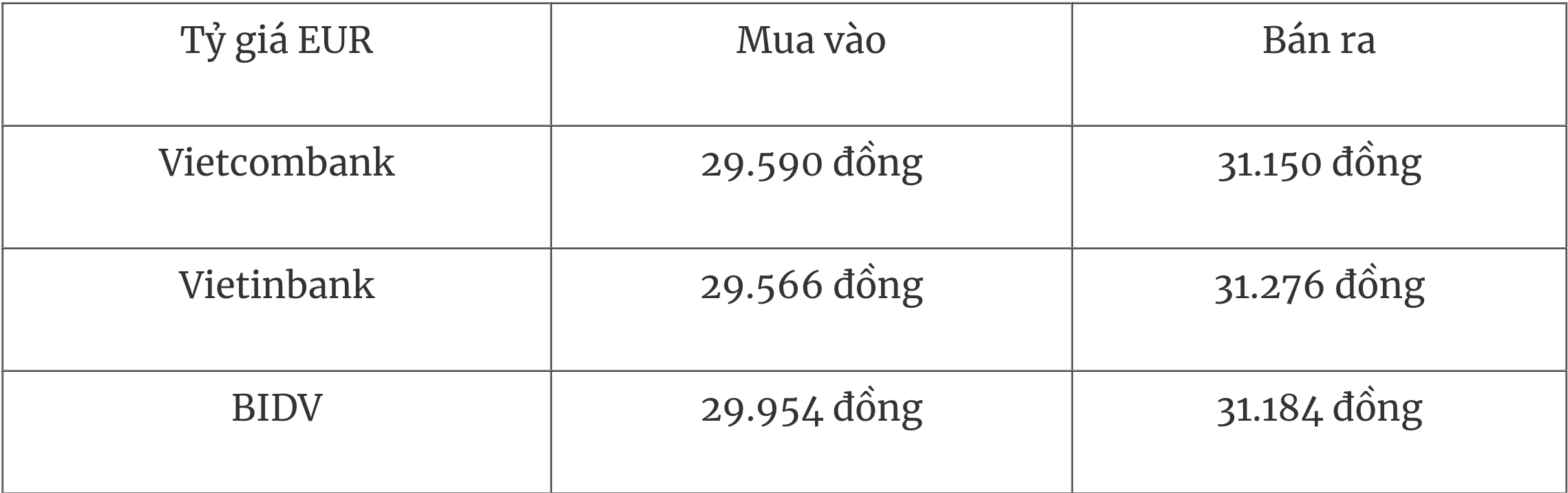Tỷ giá EUR tại một số ngân hàng thương mại mua vào và bán ra như sau: