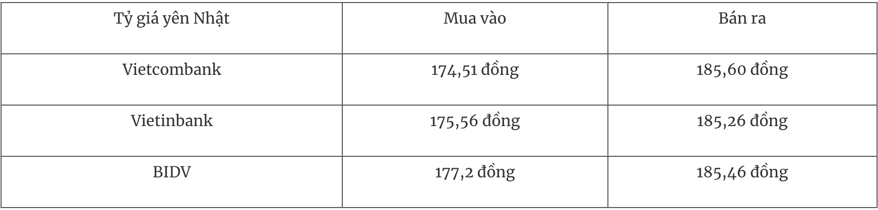 Tỷ giá YEN tại một số ngân hàng thương mại mua vào và bán ra như sau: