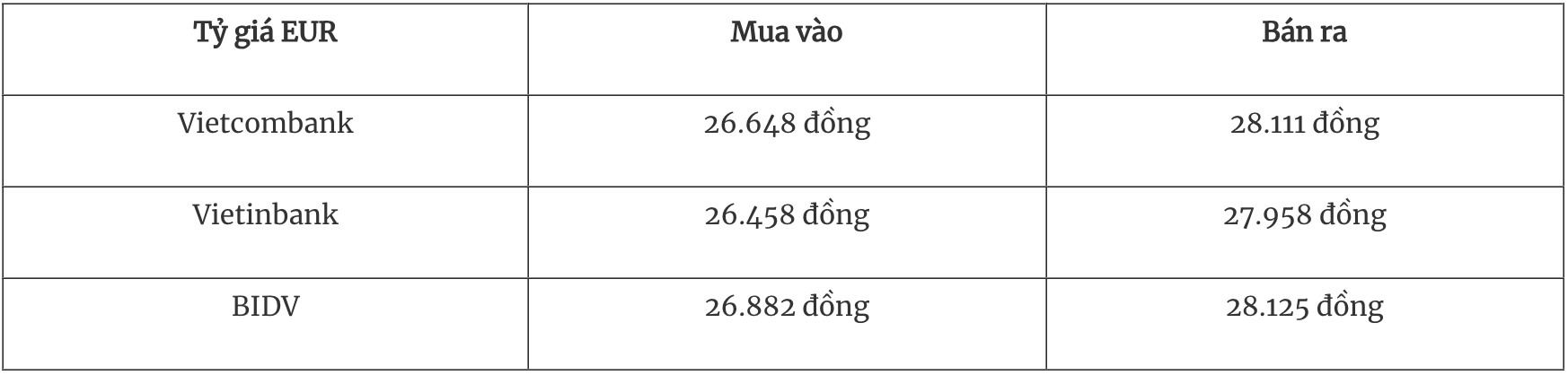Tỷ giá EUR tại các ngân hàng thương mại mua vào và bán ra như sau: