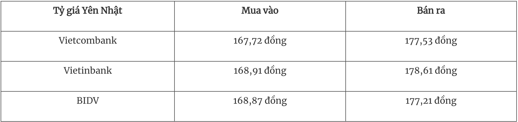 Tỷ giá Yen tại các ngân hàng thương mại mua vào và bán ra như sau: