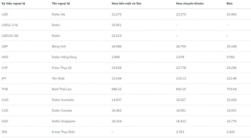 Techcombank niêm yết theo tỷ giá 23.245 đồng - 23.445 đồng.